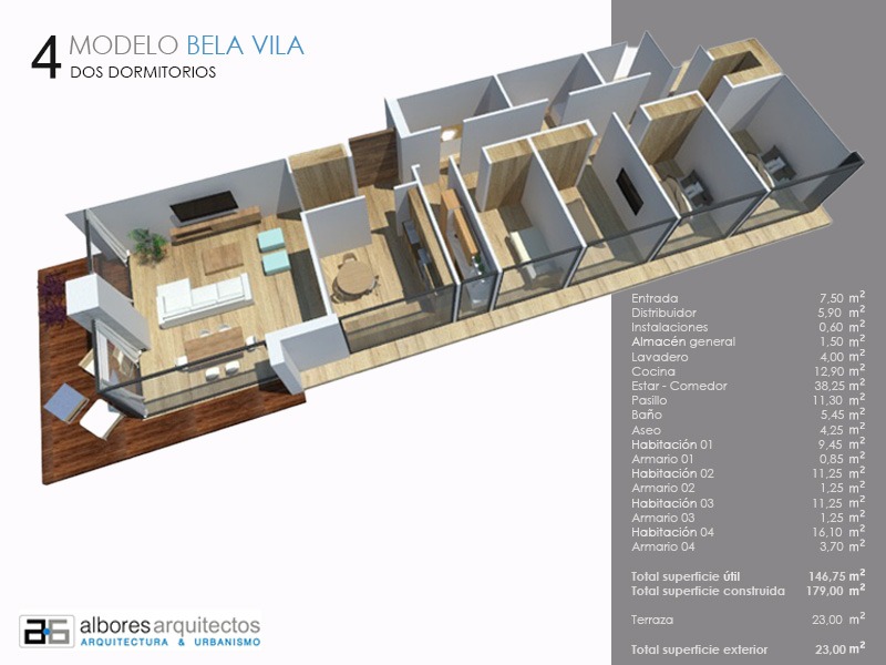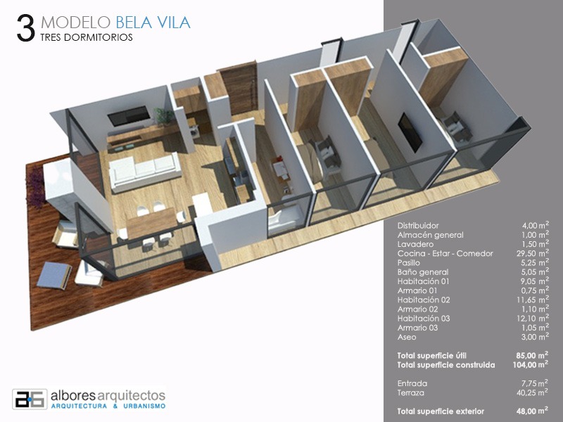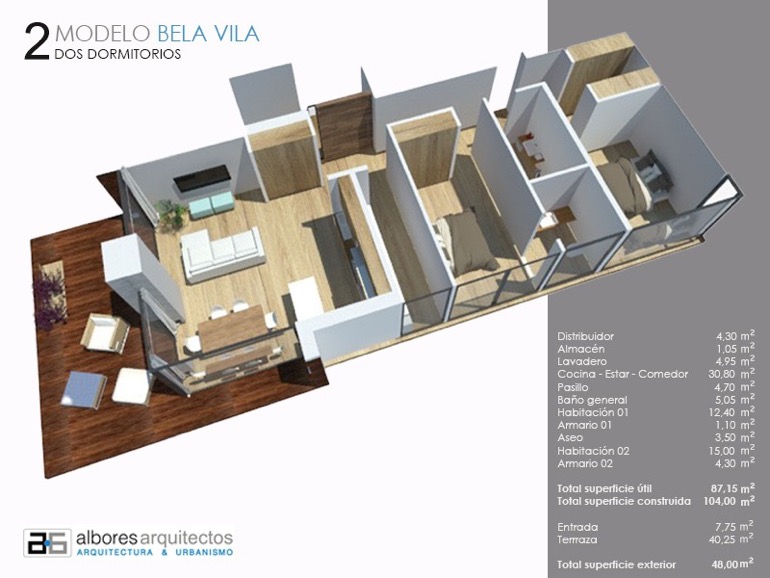 Actualmente está disponible en 3 formatos diferentes que van desde los 104 m2 construidos en el modelo de 2 habitaciones pasando por el de 3 habitaciones con 120 m2 hasta llegar a los 179 m2 del modelo de 4 habitaciones; todos ellos con una terraza exterior de 24 m2