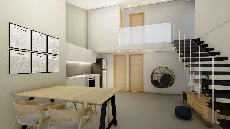 This double-height space is defined by the slope of the roof and in it is on the ground floor the day area consisting of kitchen-living-dining room as well as a bathroom and a bedroom, while on the upper floor, which is accessed via a colorful staircase straight next to one of the side walls of the façade and topped by an interior balcony, there is a second bedroom with its corresponding bathroom.