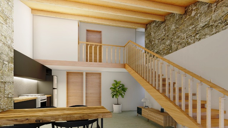 On the outside, the exposed granite stone walls on the three façades of the building are recovered, while the enlarged parts are finished with traditional lime and cement mortar for later painting. In addition, the carpentry and exterior openings are redefined in the new spaces created without losing the original and traditional spirit of the building.